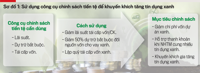 Về chính sách tiền tệ, Chính phủ có thể đẩy nguồn lực qua hệ thống ngân hàng vào các dự án xanh và phương án sản xuất xanh, thông qua việc giảm mức lãi suất tái cấp vốn và tái cấp vốn cho các ngân hàng thương mại, nhằm khuyến khích các ngân hàng cho vay các dự án xanh và sản xuất xanh, hỗ trợ ngân hàng có nguồn vốn trung và dài hạn nhiều hơn để tăng cường cho vay các dự án xanh. Ngoài ra, Ngân hàng Nhà nước có thể giảm dự trữ bắt buộc đối với các ngân hàng cho vay nhiều vào các dự án xanh để dành nguồn vốn lớn hơn cho vay vào tăng trưởng xanh và kinh tế xanh như nêu trong diễn giải của sơ đồ 1.