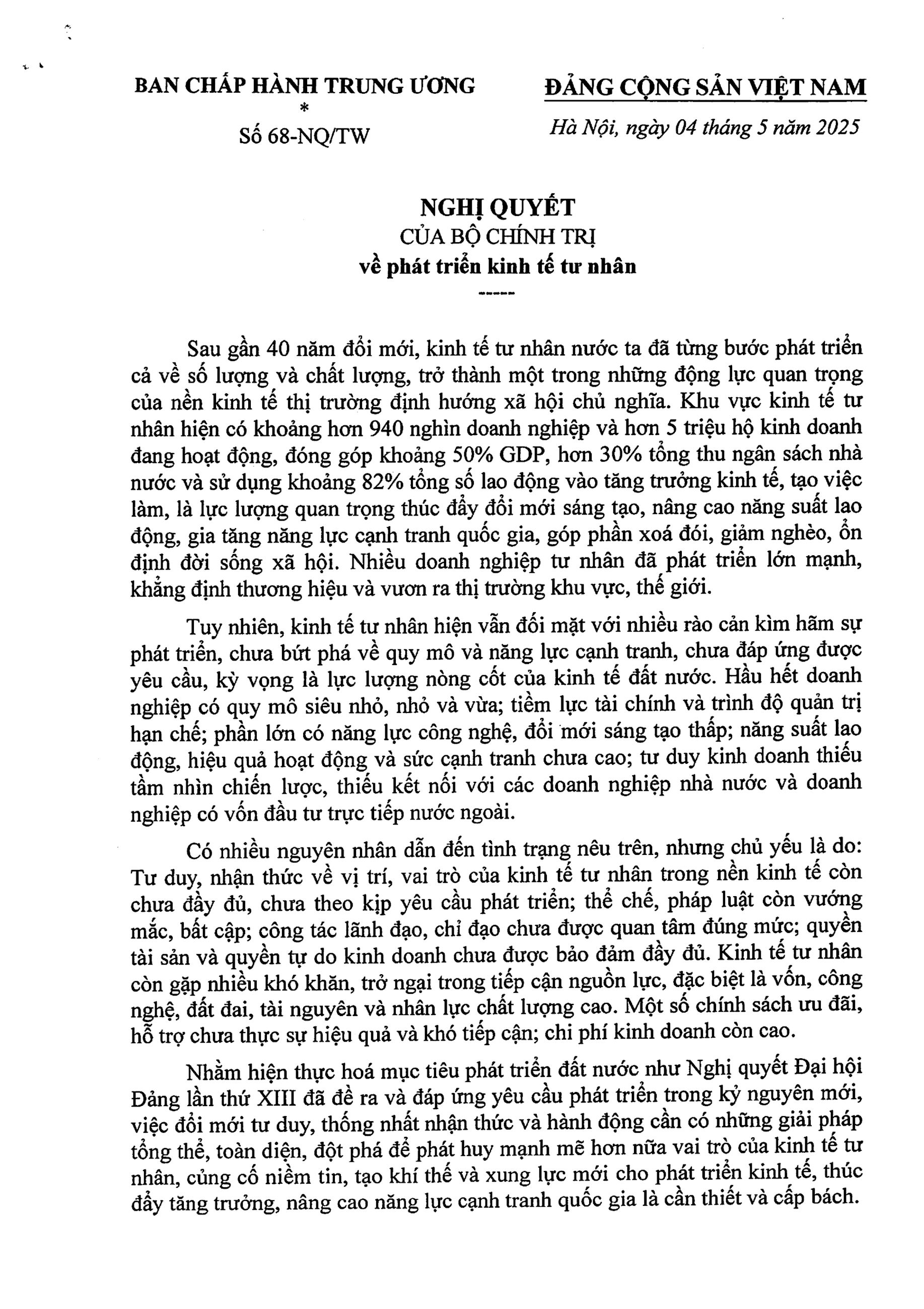 Thay mặt Bộ Chính trị, Tổng Bí thư Tô Lâm vừa ký Nghị quyết số 68-NQ/TW ngày 4/5/2025 của Bộ Chính trị về phát triển kinh tế tư nhân. Cổng Thông tin điện tử Chính phủ trân trọng giới thiệu toàn văn Nghị quyết này.
